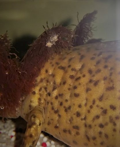 Symptômes : L'axolotl présente des branchies abîmées, raccourcie. Sa peau pèle sur le dessus du corps. La couleur est plus opaque, plus pale. Sa queue peut aussi présenter une courbe à son extrémité et ses yeux être totalement recouverts d'une pellicule blanche.